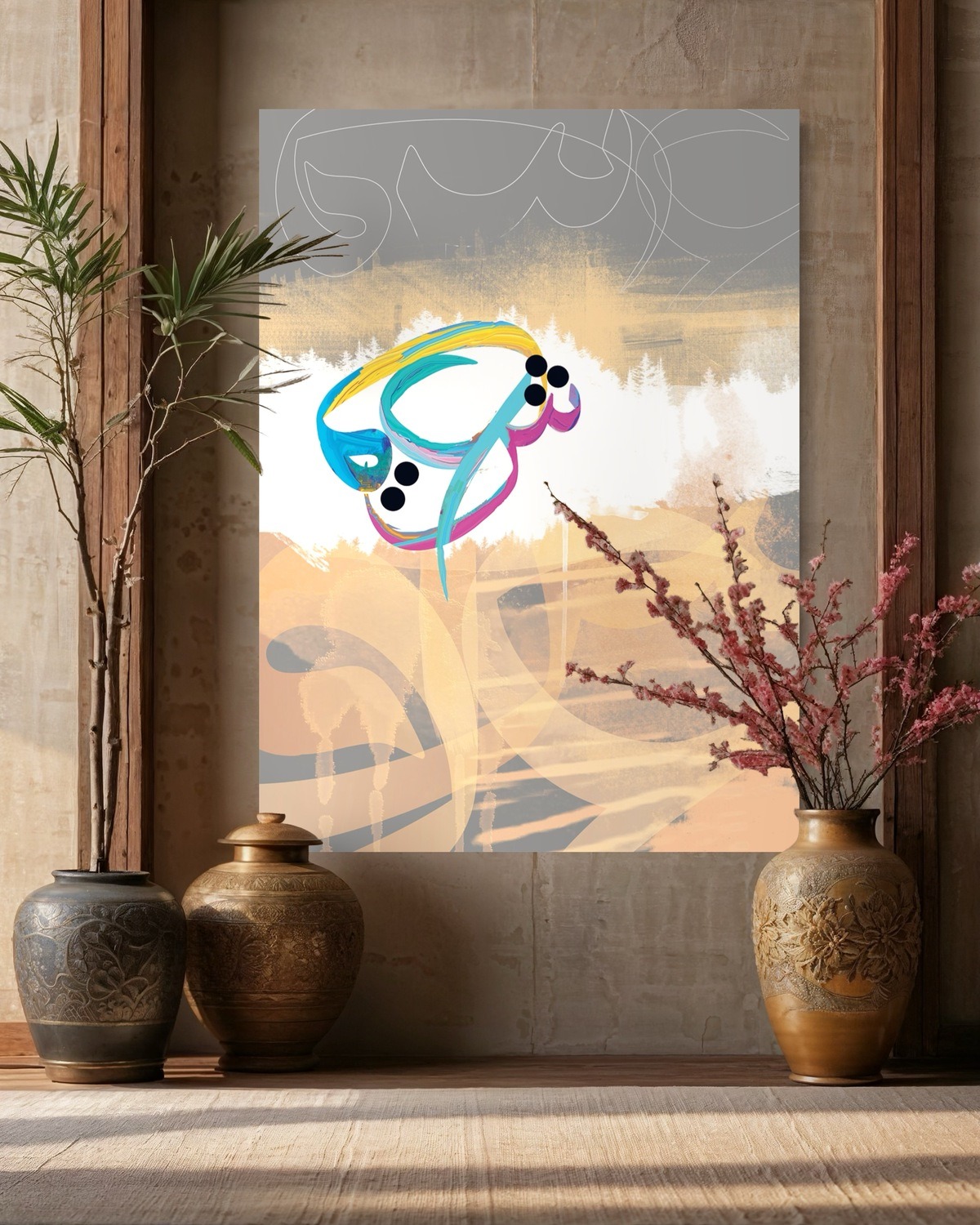 لوحة جدارية بخط الثلث العريق بعنوان "عشق أبدي" هي تجسيد بصري لأسمى المشاعر الإنسانية. من خلال تداخل الألوان الزاهية مع الحروف العربية، تخلق اللوحة حوارًا فنيًا يعكس شغفًا لا ينتهي وجمالًا لا يزول. الألوان المائية المتدفقة تمنحها إحساسًا بالحيوية والعمق، ما يجعلها أكثر من مجرد قطعة فنية، بل هي قصة حب خالدة تُروى على قماش.